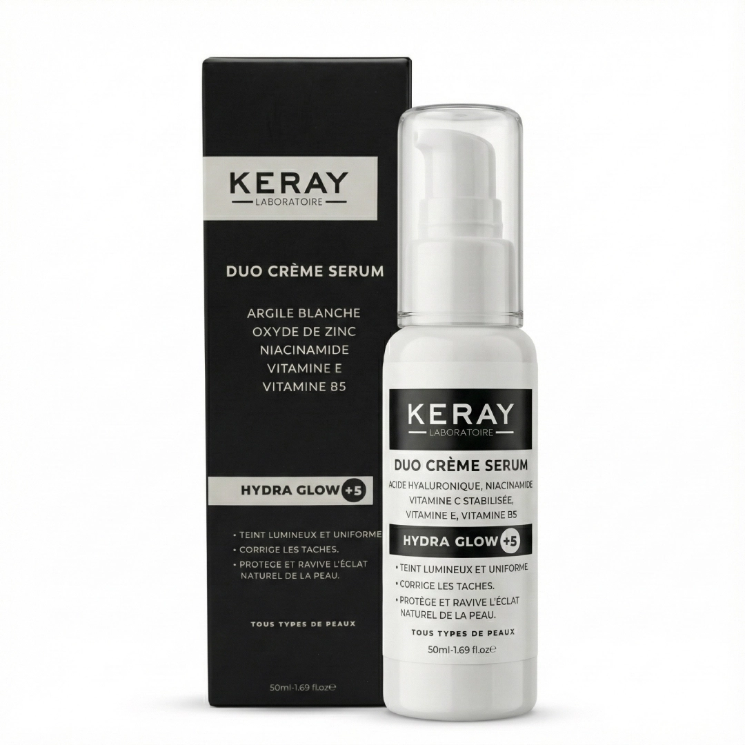 Redonnez vie à votre peau avec le Duo Crème Sérum KERAY® ! Sa formule enrichie en vitamines et antioxydants hydrate intensément, corrige les taches et unifie le teint. Résultat : une peau lumineuse, douce et protégée au quotidien. Idéal pour retrouver un éclat naturel et durable.
